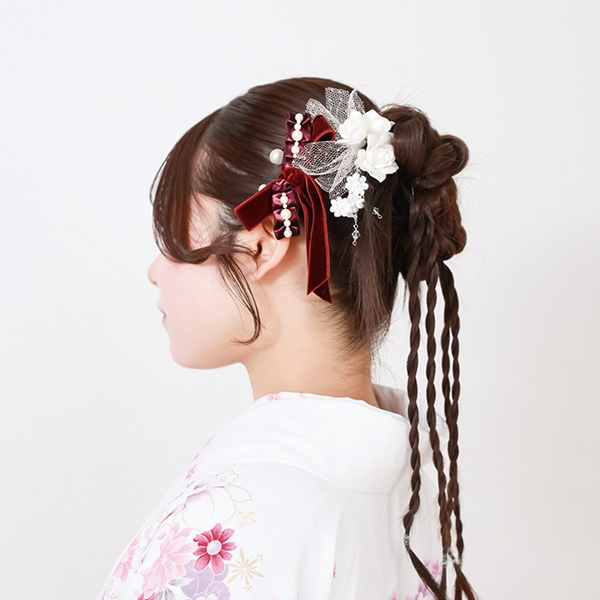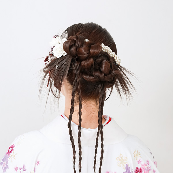 「ロープ編みの動きが映える、華やかで存在感あるアップスタイル」 ロープ編みをアクセントにした、やわらかな印象のアップスタイル。上品ながら動きもあり、幅広い袴に合わせやすい仕上がりです。